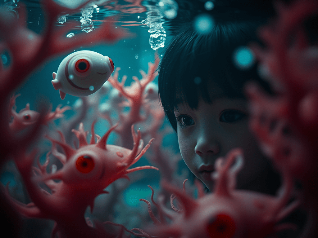 Aber was ist das überhaupt für ein Film? Über knapp 70 Minuten Laufzeit werden unzählige kurze KI-Clips präsentiert. Jede Einstellung ist rund 3-4 Sekunden lang und untermalt von recht generischer Ambient-Musik, die ebenfalls gut und gerne KI-generiert sein könnte. Es gibt kein Voice-over und auch sonst keine größere Form der Erzählung. Die Bilder sind lediglich ein wenig thematisch sortiert. Erst kommen die gruseligen Unterwasserwesen, es gibt lachendes Gemüse und später sehr viele verstörend leere Kinderaugen. Oft besteht die Einstellung daraus, wie sich ein Mensch in Richtung Kamera dreht und sie auf ihn zufährt. So bietet der Film zumindest eine minimale Erzählung an: von bunten “paradiesischen” Bildern geht es immer tiefer hinein in den Abgrund. Mal sind die Bilder knallbunt, mal in schwarz-weiß und alles bewegt sich in Zeitlupe. Neu wirken diese Bilder nicht, es fühlt sich eher wie eine sehr ausgedehnte Tech-Demo an, die aber vor allem zu zerstören weiß. Es sind außerdem zutiefst generische Bilder: die leidenden Kinder wirken wie aus einer schlechten UNICEF Werbung, manch andere Einstellung mit tief stehender Sonne sieht wie stock footage aus, man weiß, wo die KI ihre Bilder her hat und merkt genau in dem Moment wie leer diese Kreationen sind. In diesen Bildern steckt keine Aussage, kein kreativer Gedanke und auch das einzige, was hier noch menschlich ist, nämlich die Montage, verpasst es, die Bilder in irgendeinen interessanten Sinnzusammenhang zu setzen. Diese Bilder stehen für sich und damit für nichts. Sich das eine über Stunde lang anzuschauen, gleicht einer Aushalte-Probe. Wie lange hält man durch, bis man nicht mehr kann? Niemandem ist es hier zu verübeln, früher den Saal zu verlassen, da wirklich keine Erkenntnis dadurch verloren ist. Wo man sonst auch nach dem schlechtesten Film zumindest einen Gedanken mehr im Kopf hat, ist man hier am Ende mit einer komischen Leere konfrontiert. Diese Bilder bedeuten nichts. Aber statt den Kinosaal zu verlassen, kann man auch die Augen schließen und sich lieber den Bildern der eigenen Träume hingeben. Denn dazu liefert der Film immerhin die passenden Hintergrundklänge.